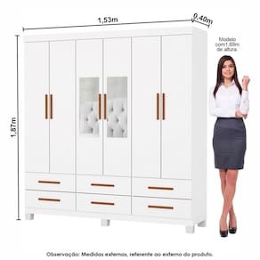 Guarda-Roupa Denver 6 Portas 6 Gavetas Com Espelho e Pés, é um produto perfeito para quem possui um ambiente com espaço reduzido e ainda procura qualidade e durabilidade no mesmo móveis. Possui 1,87m de altura, 1,53m de largura e 0,40m de profundidade combinado com 6 portas, 6 gavetas, 2 prateleiras e um grande cabideiro, deixando o produto com uma ótima divisão interna. As prateleiras são perfeitas para colocar roupas como blusas, shorts, regatas, kits de maquiagem, toalhas, caixinhas com acessórios e bolsas menores. As gavetas fixadas sobre corrediças metálicas, são ideais para guardas blusas dobradas, shorts, malhas e roupas íntimas. Estrutura do produto em MDP.