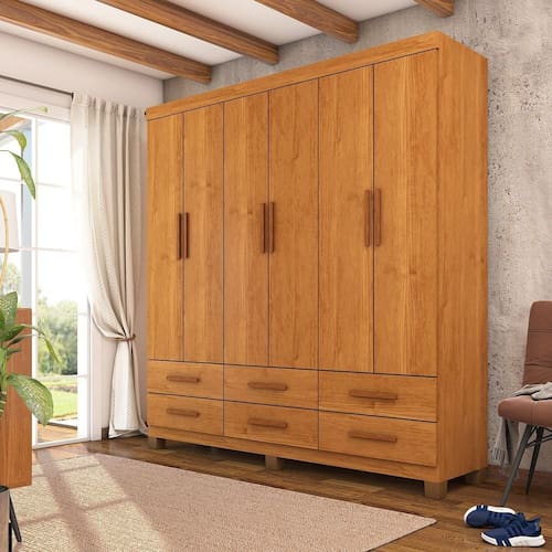 Guarda-Roupa Denver 6 Portas 6 Gavetas Com Pés, é um produto perfeito para quem possui um ambiente com espaço reduzido e ainda procura qualidade e durabilidade no mesmo móveis. Possui 1,87m de altura, 1,53m de largura e 0,40m de profundidade combinado com 6 portas, 6 gavetas, 2 prateleiras e um grande cabideiro, deixando o produto com uma ótima divisão interna. As prateleiras são perfeitas para colocar roupas como blusas, shorts, regatas, kits de maquiagem, toalhas, caixinhas com acessórios e bolsas menores. As gavetas fixadas sobre corrediças metálicas, são ideais para guardas blusas dobradas, shorts, malhas e roupas íntimas. Estrutura do produto em MDP. Acabamento da Prateleira: Verniz Escala de Brilho da Prateleira: Semi-Fosco Possui Cabideiros: Sim Acabamento da Gaveta: Pintura Escala de Brilho da Gaveta: Semi-Brilho Material do Puxador da Gaveta: PVC Possui Organizador de Gaveta: Não Acabamento da Porta: Pintura UV Escala de Brilho da Porta: Fosco Material do Puxador da Porta: PVC Acabamento dos Pés: Pintura Altura dos Pés: 7 cm Altura Máxima dos Pés: 7.0000 Ambiente Principal: Quarto codigo_ean: 7900288228284 Complexidade da Montagem: Média: pode ser montado por mais de uma pessoa e/ou necessite de maior conhecimento para montagem Cor: Cinamomo Cor da Porta: Cinamomo Cor do Produto: Cinamomo Cor do Puxador: Bronze Cor Interna: Branco Escala de Brilho: Fosco Espessura da Estrutura (mm): 12 mm Espessura das Portas (mm): 12 mm Espessura das Prateleiras (mm): 12 mm Espessura do Fundo (mm): 2,5 mm Espessura do Fundo das Gavetas (mm): 2,5 mm Gaveta com Chave: Não Itens Inclusos: 1 Guarda-Roupa e Kit Ferragens Linha ou Coleção: Denver Manual de Montagem e Instalação: https://product-hub-prd.madeiramadeira.com.br/836501353/documents/e37be59c-1bb2-4687-943c-c3ff095e1e8c319750140417576126868669.pdf Marca: Carioca Móveis Material da Gaveta: MDP Material da Porta: MDP Material da Prateleira: MDP Material dos Pés: PVC Material Principal: MDP modular: Não Necessita Montagem: Sim Origem do Produto: Nacional Peso: 68,2 kg Peso Máximo por Gaveta: 5 kg Peso Máximo por Prateleira: 5 kg Porta Janelada: Não Possui Calceiros: Não Possui Espelho: Não Possui Pés: 06 Possui Portas: Sim Possui Prateleiras: Sim Produto Montado: Sim Quantidade de Cabideiros: 01 Cabideiro Quantidade de Gavetas: 06 Gavetas Quantidade de Prateleiras: 02 Prateleiras Recomendações de Uso, Manutenção e Limpeza: Limpar com flanela ou pano macio seco. Não utilizar produtos abrasivos, desengordurantes, álcool ou solvente. Não expor o produto diretamente à luz solar e à umidade. Sapatas Niveladoras: Não Sistema de Montagem: Parafusos e Cavilhas Tipo de Corrediça da Gaveta: Metálica Simples Tipo de Dobradiça/Corrediça da Porta: Metálica Tipo de Gaveta: Externa Tipo de Guarda-Roupa: Casal Tipo de Puxador da Gaveta: Externo Tipo de Puxador da Porta: Externo