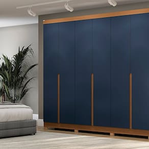 Renove seu quarto com o Roupeiro CB02R582 da Kappesberg. Com seis portas e quatro gavetas, são 2,23m de altura, 2,42m de largura e 47cm de profundidade, produzido 100% em MDF de 15mm, o que garante mais robustez, firmeza e qualidade. Com sete camadas de pintura, tanto na parte interna quanto na externa, a caixaria é na cor canela, com acabamento touch, e as portas, são na cor azul profundo, em acabamento fosco, uma combinação linda e moderna ao espaço, e os puxadores cava completam o estilo do produto. Na parte interna, ele possui nichos de tamanhos diferentes, cabideiros metálicos e com suporte interno, e gavetas com corrediças telescópicas, permitindo que você ocupe melhor o espaço. E para completar, ele possui pés em polipropileno.