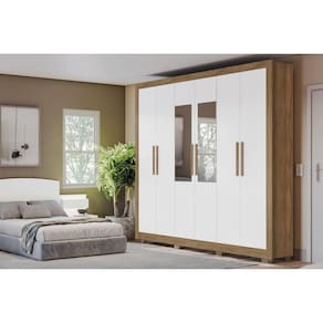 Seu quarto mais lindo e moderno com o Roupeiro CB02M569 da Kappesberg. Com seis portas, são 2,23m de altura, 2,32m de largura e 47cm de profundidade, todo produzido em chapa MDP de 15mm, o que garante mais robustez e qualidade. Com sete camadas de pintura, na parte interna e externa, a caixaria possui pintura touch na cor nogueira, e as portas, na cor branca, possuem acabamento brilho. Uma combinação que dará mais luminosidade e aconchego ao espaço. O destaque fica por conta dos espelhos, dos puxadores em madeira e da moldura, deixando-o mais sofisticado. Na parte interna, ele possui nichos de tamanhos diferentes, cabideiros metálicos com suporte interno, e duas gavetas com corrediças metálicas, deixando tudo organizado. E os espelhos e pés em polipropileno completam o design do produto.