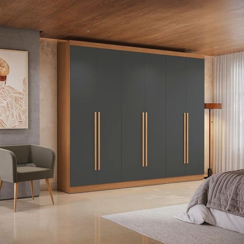 Aposte no Roupeiro T580 da Kappesberg. Com seis portas e três gavetas, são 2,30m de altura, 2,70m de largura e 47cm de profundidade, 100% em MDP, para mais organização e durabilidade. Com corpo em pintura touch na cor canela, com a textura dos veios da madeira, as portas são na cor grafite e acabamento fosco. Os puxadores alongados completam o charme do produto. Perfeito para quem gosta de espaço, nos nichos de tamanhos diferentes você organiza calçados e roupas dobradas nas prateleiras. Os cabideiros, metálicos e com suporte interno, são ideais para peças maiores, como casacos e vestidos. Já as gavetas, com corrediças telescópicas, permitem a abertura total e um melhor aproveitamento de espaço. O destaque é o sistema de amortecimento nas portas, para um fechamento suave e sem ruídos. Acabamento da Prateleira: Pintura UV Escala de Brilho da Prateleira: Fosco Possui Cabideiros: Sim Acabamento da Gaveta: Pintura UV Escala de Brilho da Gaveta: Fosco Material do Puxador da Gaveta: MDP Possui Organizador de Gaveta: Não Acabamento da Porta: Pintura UV Escala de Brilho da Porta: Fosco Material do Puxador da Porta: MDF Ambiente Principal: Quarto codigo_ean: 7900288251114 Complexidade da Montagem: Média: pode ser montado por mais de uma pessoa e/ou necessite de maior conhecimento para montagem Cor: Canela/Grafite Cor da Porta: Cinza Cor do Produto: Canela/Grafite Cor do Puxador: Marrom Cor Interna: Canela Escala de Brilho: Fosco Espessura da Estrutura (mm): 12 mm Espessura das Portas (mm): 15 mm Espessura das Prateleiras (mm): 12 mm Espessura do Fundo (mm): 3 mm Espessura do Fundo das Gavetas (mm): 3 mm Gaveta com Chave: Não Informações Complementares: Portas com sistema de amortecimento Itens Inclusos: 1 Roupeiro, Manual de Montagem e Kit Ferragens Linha ou Coleção: Dormitorio Bigger Lo Manual de Montagem e Instalação: https://product-hub-prd.madeiramadeira.com.br/879885837/documents/23a2b33e-fda9-468f-9c2a-32811e49300f3260070544517595192294726.pdf Marca: Kappesberg Material da Gaveta: MDP Material da Porta: MDP Material da Prateleira: MDP Material Principal: MDP modular: Não Necessita Montagem: Sim Origem do Produto: Nacional Peso: 158,0846 kg Peso Máximo por Gaveta: 6 kg Peso Máximo por Prateleira: 7 kg Porta Janelada: Não Possui Calceiros: 01 Possui Espelho: Não Possui Pés: Não Possui Portas: Sim Possui Prateleiras: Sim Produto Montado: Sim Quantidade de Cabideiros: 02 Cabideiros Quantidade de Gavetas: 03 Gavetas Quantidade de Prateleiras: 07 Prateleiras Recomendações de Uso, Manutenção e Limpeza: Use um pano limpo e ligeiramente umidecido em água ou álcool (recomendamos álcool etílico hidratado). Logo após, seque a superfície com um pano seco e macio. Em grandes superfícies limpe pequenas áreas de cada vez, trabalhando de baixo para cima. Sistema de Montagem: Parafuso Philips e Mitofix Tipo de Corrediça da Gaveta: Metálica Telescópica Tipo de Dobradiça/Corrediça da Porta: Metálica Tipo de Gaveta: Interna Tipo de Guarda-Roupa: Casal Tipo de Puxador da Gaveta: Embutido Tipo de Puxador da Porta: Externo