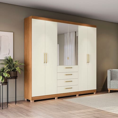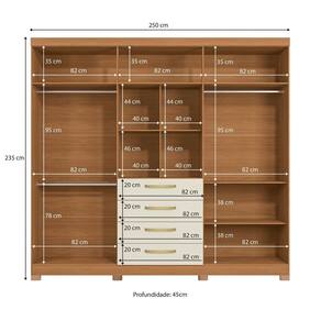 Um verdadeiro clássico, aposte no Roupeiro CB01T585 da Kappesberg. São 2,35m de altura, 2,50m de largura e 47cm de profundidade, produzido em MDP de 1,2cm e portas em 1,5cm, garantindo resistência e durabilidade. As gavetas externas, com corrediças telescópicas, garantem praticidade. E nas portas centrais, você terá o espaço ideal para organizar itens de uso diário. Com amplo espaço, o roupeiro também oferece nichos de tamanhos diferentes e cabideiros metálicos de suporte interno. Com caixaria na cor canela e acabamento touch, as portas são na cor off white em acabamento fosco. Nas portas, o destaque é o sistema de amortecimento, garantindo um fechamento suave, e os espelhos proporcionam mais luminosidade. E os puxadores e pés em polipropileno completam a beleza e o diferencial do produto.