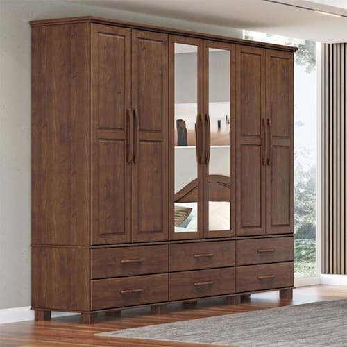 Características: Estrutura 100% em Madeira Maciça de Pinus Pintura Acetinada Verniz PU e UV Amplo espaço para armazenamento 06 Gavetas com Corrediças Telescópicas 06 Portas Dobradiças com amortecimento Portas Centrais Possuem Espelho Cabideiro em alumínio Prateleiras Internas Puxadores e Pés em Madeira Maciça Peso Máximo Suportado pelas Gavetas 05kg Distribuídos Peso Máximo Suportado pelas Prateleiras 10kg Distribuídos Peso Máximo Suportado pelo Cabideiro 08kg Distribuídos Isolamento de Peças com Manta de Polietileno Expandido (Isomanta)