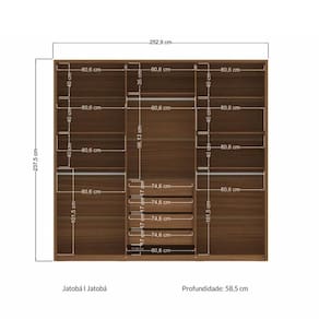 Requer montagem: Sim | Inclui manual de montagem: Sim | Quantidade de caixas de embalagem: 4 | Comprimento: 58,5 | Profundidade: 58,5 | Altura: 237,5 | Largura: 252,8 | PESO PRODUTO COM EMBALAGEM (KG): 213,9 | PRODUTO: Guarda Roupa | GARANTIA DO FABRICANTE: 3 | QUANTIDADES DE CAIXAS DE EMBALAGEM: 4 | CORES DO PRODUTO (FILTRO DE CORES): Jatobá | COMPRIMENTO DO PRODUTO (CM): 58,5 | DESCRIÇÃO DO TAMANHO: 237,5x252,8x58,5 | COMPRIMENTO PRODUTO COM EMBALAGEM (CM): 253,3 | QUANTIDADE DE GAVETAS: 4 | POSSUI ESPELHOS: Não possui | LARGURA DO PRODUTO (CM): 252,8 | ESTILO: Clássico | INSTRUÇÕES/CUIDADOS: Limpar com flanela ou pano macio seco, não utilizar produtos abrasivos, desengordurantes, álcool ou solvente. Não expor o produto diretamente à luz solar e à umidade | PESO DO PRODUTO (KG): 209,9 | PRODUTO PRECISA DE MONTAGEM?: Sim, a montagem é facil mas sugerimos a contratação de um montador para a montagem do produto. Não nos responsabilizamos por danos causados no ato da montagem. | MATERIAL PRINCIPAL: MDP | TIPO DE GUARDA ROUPA: Casal | QUANTIDADE DE PORTAS: 6 | ALTURA DO PRODUTO (CM): 237,5 | MATERIAL PARA FILTRO: MDP | ESTADO DE ORIGEM: PR | ALTURA DO PRODUTO COM EMBALAGEM (CM): 50,3 | LARGURA PRODUTO COM EMBALAGEM (CM): 54,9 | CONTEÚDO DA EMBALAGEM: 1 Guarda Roupa | COR PREDOMINANTE: Jatobá