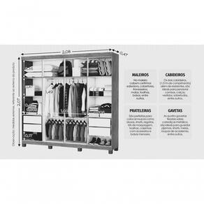 Com um design moderno e funcional, ele conta com 8 portas, gavetas espaçosas, prateleiras bem distribuídas, espelho central e um excelente espaço para cabides, garantindo uma organização prática para roupas, acessórios e objetos pessoais.