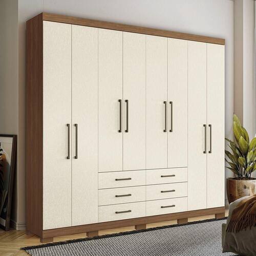 Guarda Roupa 8 Pt E 6 Gv Com Pés Havana Master Santos Andirá Jatoba/areia Um guarda-roupa de casal completao, esse e Guarda Roupa Havana Master 8 Portas da Santos Andira! Com muito espaco para todas as suas roupas, ele conta com 6 amplas gavetas, que alem de espacosas, deslizam sobre corredicas telescopicas, facilitando o abrir e fechar de todos os dias. Possui espaco interno com 4 cabideiros/calceiros em aluminio, para pendurar as roupas com organizacao. Puxadores em ABS, deixando o movel com design muito moderno. O seu quarto ficara muito mais bonito e pratico com esse modelo de roupeiro incrivel! Caracteristicas: Estrutura: MDP 12mm e 15mm Acabamento: Pintura UV e Verniz Quantidade de Portas: 8 de Bater Tipo de Dobradicas: Metalicas Simples Quantidade de Gavetas: 6 Tipo de Corredicas: Metalicas Telescopicas Quantidade de Prateleiras: 10 Tipo de Puxador: Plastico ABS Quantidade e Tipo de Cabideiros: 4 em Aluminio Tipo de Pes: 10 Pes em PVC Suporte ate: Gavetas suportam ate 3kg cada e prateleiras ate 8kg cada Sistema de Montagem: Cavilhas, Parafusos e Minifix Itens Inclusos: 1 Guarda Roupa, Kit Ferragens e Manual de Montagem Garantia: 3 meses Manutencao: Nao limpar com alcool ou qualquer outro produto quimico, utilize somente pano seco ou levemente umedecido.