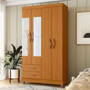 Produto: Guarda Roupa Âmbar 4 Portas com Espelho Cor: Cinamomo Puxadores Com Acabamento Metalizado Bronze Escala de Brilho: Fosco Altura (m): 1,89 Largura (m): 1,03 Profundidade (m): 0,47 Peso (kg): 55,75 Material: MDP Acabamento: Pintura Uv Material do Puxador: Abs Tipo de Cabideiro: Madeira Quantidade de Gavetas: 2 - Tipo de Corrediça: Metálicas Quantidade de Portas: 4 - Tipo de Porta: Bater Quantidade de Prateleiras: 3 Rodízios: Não Quantidade de Pés: 4 - Material dos Pés: ABS Necessita Montagem: SIM Espelho: Kit 4 Espelhos 0,46 X 0,20 M Cada Manutenção: Limpar Com Flanela Ou Pano Macio Seco, Não Utilizar Produtos Abrasivos, Desengordurantes, Álcool Ou Solvente. Não Expor O Produto Diretamente À Luz Solar E À Umidade. Garantia: 3 Meses