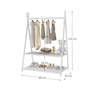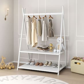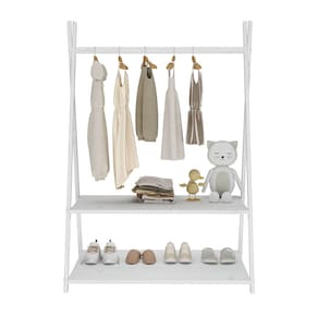 O cabideiro tem altura acessível para pendurar roupinhas com facilidade, e as duas prateleiras permitem organizar sapatos, brinquedos e objetos do dia a dia.