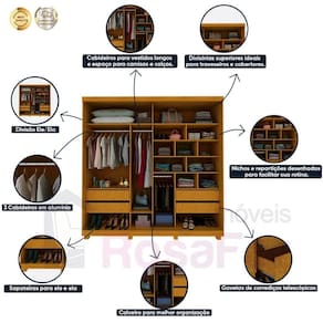 O roupeiro Ares é moderno e funcional, com um interno repleto de nichos, repartições e gavetas, é o sonho de consumo de qualquer um. Possui tubos cabideiros para vestidos e peças longas, espaço para camisas e calceiro. Quatro gavetas espaçosas de corrediças telescópicas e divisórias para sapatos, travesseiros e cobertores. Com nichos organizadores que otimizam o espaço e facilitam a organização. Conta com uma porta espelho.