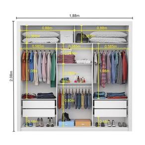 Guarda roupa com 3 portas de correr. Compacto e funcional, a linha Bahia possui 4 gavetas, 4 prateleiras e 3 cabideiros. As roldanas em aço e o trilho em alumínio tem a funçaõ de potencializar o deslizar das portas. As 4 gavetas são fixadas sobre corrediças metálicas, são ideias para guardar pijamas, shorts, meias, roupas de academia entre outros. As 4 prateleiras são perfeitas para colocar roupas como blusa, shortes, regatas, kit de maquiagem, tolhas caixinhas com acessórios e bolsas menores. Os 3 cabideiros além de resistentes são ideias para pendurar camisas calças, vestidos. Nos maleiros cabem certinhos edredons, cobertores, travesseiros, malas, toalhas, entre outros.