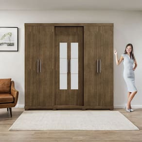 Renove seu quarto com elegância e funcionalidade com o Guarda-Roupa Barcelos Casal com Espelho. Com um visual contemporâneo e imponente, este modelo combina perfeitamente estética e praticidade, destacando-se pelo design com porta central recuada e seis espelhos que ampliam o ambiente e trazem mais conforto ao dia a dia.