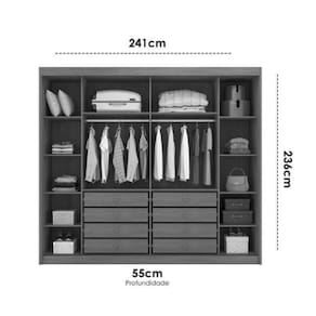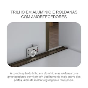 Características Colunado em 25mm Trilho inferior em alumínio e roldanas com amortecedores Interno ele e ela Espelho inteiro Fundo inteiriço Perfil Puxador em alumínio com guia zero e freio Gavetas internas com puxadores e corrediças telescópicas Cabideiros e calceiro em alumínio