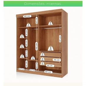É um móvel conceitual e impressiona pelo seu acabamento e tamanho, pelos espaços bem distribuídos e os detalhes pensados para atender as mais variadas necessidades do usuário, são eles: puxadores metálicos moderno e funcional, cabideiros e calceiro metálicos, nichos central para acessórios, sapateiras e espaço para longos, gavetas com corrediças telescópicas, para acomodar os seus pertences e proporcionar a melhor organização do espaço.