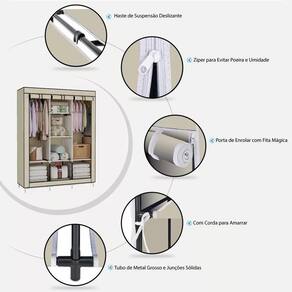Este guarda-roupa portátil é uma excelente unidade de arrumação para manter o seu quarto limpo e arrumado. Com espaço extra para suas roupas, sapatos, livros, brinquedos e muito mais, é perfeito para qualquer quarto. Vem com uma capa de tecido não tecido que não só oferece uma ótima aparência, mas também uma maneira fabulosa de esconder qualquer bagunça feia.Características:Material Durável: Fabricado com aço durável e resina à prova de sujeira, fácil de limpar para manutenção e ço Generoso: Longos espaços para pendurar permitem vestidos de noite e trajes espaciais ocasionais, enquanto as prateleiras oferecem espaços menores para roupas dobráveis, acessórios e outros itens.Instalação Fácil: Fácil montagem, não são necessárias ferramentas ou habilidades especiais, leva de 15 a 20 de Enrolar: A capa de enrolar evita a entrada de poeira, mantendo suas roupas limpas e Portátil: Leve e portátil, feito de estruturas de ferro forjado com coberturas de tecido não tecido, pode ser movido facilmente para os espaços necessários.Especificações:Material: MetalCapacidade de Carga: 100 quilogramasNúmero de Prateleiras: 8Tamanho: 130x45x175Os guarda-roupas dessa linha são instalados em salas lotadas, servindo como peças decorativas e também como convenientes espaços de armazenamento de emergência para compras impulsivas. Sua leveza e portabilidade garantem facilidade de movimentação conforme necessário.
