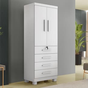 Guarda Roupa Camiseiro New Maia 2 Portas 4 Gavetas - Benetil Branco O Guarda-Roupa New Maia com seu lindo design tras charme e elegancia a qualquer ambiente, possui 4 gavetas e 2 portas, contem chave que garante sua privacidade, com cabideiro em aluminio tem muito espaco para seus cabides, acomodando todos seus pertences, ficando muito bem-organizado. Sua fabricacao utiliza a linha mdp perffect, que une a sustentabilidade a inovacao tecnologica, proporcionando durabilidade e facil limpeza; inspirando sofisticacao ao mobiliario. Sua pintura UV conta com boa resistencia, e facil de limpar e e ecologicamente correto, pois utiliza madeira de reflorestamento, evitando o desmatamento. Caracteristicas: Material principal: MDP Espessura das chapas: 15 mm Escala de brilho: semi fosco Acabamento: Pintura UV Sistema de montagem: parafuso, cavilha e cantoneiras metalicas Quantidade de Portas: 2 Quantidade de Gavetas: 4