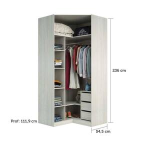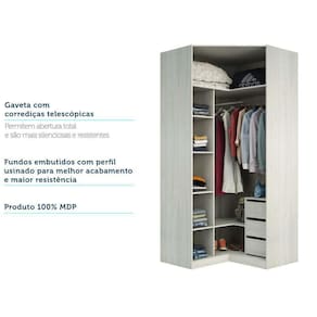 Guarda Roupa Closet Aberto Canto Diagonal 3 Gavetas 1 Cabideiro 111,90cm Prime Luciane Móveis Legno Crema Guarda Roupas sem Portas Modulado para Closet com 3 Gavetas, 1 Cabideiro, 1 Maleiro e 5 Prateleiras com 111,90cm de largura. A linha de roupeiros projetados Prime Closet é o sonho de consumo dos projetos de Closets. Produto 100 em MDP 15mm com acabamento impecável e rápida montagem. Possui 3 gavetas com corrediças telescópicas em três estágios, oferecendo para abertura total das gavetas. Também conta com cabideiro em alumínio, 1 maleiro amplo para objetos ou peças maiores e 6 prateleiras para auxiliar na organização de peças ou objetos menores. Esse produto é muito versátil, podendo ser utilizado em diversos cômodos da sua casa, garantindo a você monta-lo de acordo com suas preferência e necessidade. Aproveite essa oportunidade para transformar seu sonho em realidade.