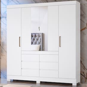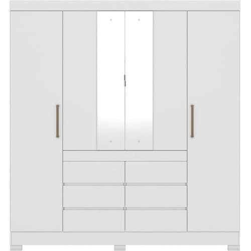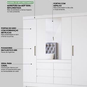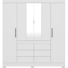 Guarda Roupa Casal 04 Portas Com Espelho 66510, moderno e sofisticado, permite guardar muitas coisas e ainda ter locais separados para o casal. Estrutura 100% em MDP 12 mm e 15 mm, feito com material ecologicamente correto, para melhor durabilidade e resistência da peça, conta com pintura em acabamento UV. Composto por 04 portas de giro com dobradiças metálicas, sendo as centrais com espelhos, 06 gavetas contendo corrediças metálicas, maleiro para acomodar suas roupas de cama e travesseiros, 6 nichos para seus pertences, 2 prateleiras internas, 4 cabideiros metálicos, seus puxadores são em plástico ABS e os centrais metálicos e pés em PVC. Além de ampla capacidade de armazenamento, foi desenvolvido para oferecer total conforto e comodidade para você. Este móvel chegará em sua casa separado em 04 volumes.