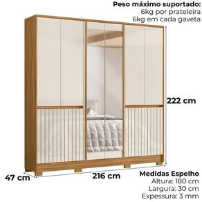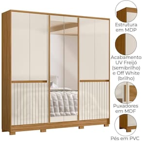 Projetado para atender às necessidades do dia a dia, o Guarda-Roupa Casal Alasca oferece espaço e modernidade. Estrutura em MDP (15/ 12 mm) e acabamento em pintura UV. Composto por portas com dobradiças metálicas (inferiores sendo passantes em MDF com detalhe frisados e centrais com espelhos), cabideiros internos (alumínio), gavetas com corrediças metálicas e prateleiras funcionais. Produto com dupla opção de montagem: pés em PVC ou sapatas plásticas (2 mm) conforme preferência do cliente. Este produto será entregue em 05 volumes.