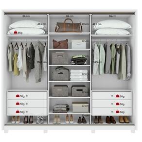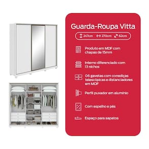 Transforme seu quarto com o Vitta 270: moderno, espaçoso e funcional. Produzido em 100% MDF com acabamento premium, ele conta com 3 portas deslizantes sendo uma com espelho inteiro que amplia o ambiente.. São 10 prateleiras, 6 gavetas com corrediças telescópicas (incluindo gaveta com colmeia organizadora), maleiro individual e amplo espaço interno com 13 nichos ideal para casais!