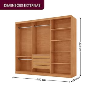 O guarda-roupa Chile 3 portas de correr em 100 MDF é a escolha perfeita para quem busca qualidade e praticidade. Fabricado com MDF, um material que oferece excelente durabilidade e resistência, ele garante um acabamento refinado. Com 6 prateleiras e 3 cabideiros, proporciona amplo espaço para organizar roupas e acessórios de forma eficiente. Seu design inteligente economiza espaço, tornando-o uma excelente opção para ambientes modernos. Acabamento da Prateleira: Pintura Texturizada UV Escala de Brilho da Prateleira: Semi-Brilho Possui Cabideiros: Sim Acabamento da Gaveta: Pintura Texturizada UV Escala de Brilho da Gaveta: Semi-Brilho Possui Organizador de Gaveta: Não Acabamento da Porta: Pintura Texturizada UV Escala de Brilho da Porta: Semi-Brilho Altura do Espelho: 60 cm Ambiente Principal: Quarto codigo_ean: 7900288219404 Complexidade da Montagem: Média: pode ser montado por mais de uma pessoa e/ou necessite de maior conhecimento para montagem Cor: Naturalle Cor da Porta: Marrom Cor do Produto: Naturalle Cor Flex: Não Cor Interna: Naturalle Escala de Brilho: Semi-Brilho Espessura da Estrutura (mm): 12 mm Espessura das Portas (mm): 15 mm Espessura das Prateleiras (mm): 12 mm Espessura do Espelho: 3 mm Espessura do Fundo (mm): 2,5 mm Espessura do Fundo das Gavetas (mm): 2,5 mm Formato do Espelho: Retangular Gaveta com Chave: Não Itens Inclusos: 1 Guarda-Roupa, Kit Ferragens e Manual de Montagem Largura do Espelho: 63,4 cm Linha ou Coleção: Chile Manual de Montagem e Instalação: https://product-hub-prd.madeiramadeira.com.br/731833144/documents/4eeb409a-c278-4ff3-89b5-61c18c3eafa83163550584417562989989567.pdf Marca: Rufato Material da Gaveta: MDF Material da Porta: MDF Material da Prateleira: MDF Material Principal: MDF modular: Não Montagem Flex: Não Necessita Montagem: Sim Nicho com Cabideiro: Sim Origem do Produto: Nacional Peso: 118,66 kg Peso Máximo por Gaveta: 4 kg Peso Máximo por Prateleira: 6 kg Porta Janelada: Não Possui Calceiros: Não Possui Capelinha: Não Possui Espelho: Sim Possui Espelho Interno: Não Possui Ganchos: Não Possui iluminação: Não Possui Nichos: Sim Possui Painel de TV: Não Possui Penteadeira: Não Possui Pés: Não Possui Portas: Sim Possui Prateleiras: Sim Produto Montado: Sim Quantidade de Cabideiros: 03 Cabideiros Quantidade de Espelho: 03 Espelhos com Tamanhos Iguais Quantidade de Gavetas: 04 Gavetas Quantidade de Portas com Espelhos: 1 Porta com Espelho Quantidade de Prateleiras: 06 Prateleiras Recomendações de Uso, Manutenção e Limpeza: Limpar com pano seco. Sistema de Montagem: Parafusos e Cavilhas Tipo de Corrediça da Gaveta: Metálica Telescópica Tipo de Dobradiça/Corrediça da Porta: Metálica Tipo de Fixação do Espelho: Parafusos Tipo de Gaveta: Interna Tipo de Guarda-Roupa: Casal Tipo de Puxador da Gaveta: Não Possui Tipo de Puxador da Porta: Externo