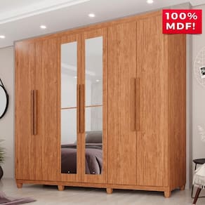 Com 6 portas e 4 gavetas espaçosas, o Guarda-Roupa Espanha oferece ampla capacidade para armazenar roupas, acessórios e calçados. Conta com estrutura 100% MDF, puxadores de madeira de 60 cm, corrediças telescópicas que proporcionam abertura total das gavetas, além de nicho central funcional e pés que ajudam a proteger a base contra umidade. Um móvel robusto, versátil e resistente, ideal para quem procura um guarda-roupa moderno e espaçoso.