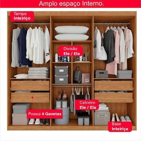 Altura: 207 cm | Largura: 182 cm | Material da Estrutura: 100% MDF | Pés: kit de pés incluso | Possui Espelho: Não | Profundidade: 42 cm | Quantidade de Gavetas: 4 gavetas | Quantidade de Portas: 6 Portas | Tipo de Portas: Bater Cor: Cinamomo/Off