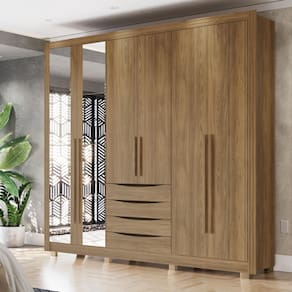 Deixe seu quarto ainda mais lindo, moderno e organizado com a linha de guarda-roupas 100% MDF da Loja Oficial Kappesberg. Na cor Nogueira, com 6 portas e 4 gavetas, espelho em duas portas e pés em polipropileno, ele tem o tamanho ideal para um quarto de casal. Todo produzido com chapas de 15mm, o que garante mais robustez, firmeza e qualidade ao seu guarda-roupas. Sua pintura é feita com sete camadas, garantindo mais durabilidade e beleza ao seu móvel. As portas possuem puxadores em madeira e sistema de amortecimento, proporcionando um fechamento suave, além do detalhe ripado em sua moldura, deixando seu quarto com ainda mais estilo e modernidade. Você precisa de espaço? Na parte interna, há muito espaço com diversos nichos de tamanhos diferentes, ideal para organizar calçados e roupas dobradas. Nos cabideiros, que são metálicos e com suporte interno, garantindo melhor acabamento e durabilidade, é possível guardar as roupas em cabides e até mesmo organizar mantas e acessórios. Suas gavetas possuem corrediças telescópicas, garantindo a abertura total, para que você aproveite todo espaço disponível feito 100% em MDF, o guarda-roupas M580 é a opção ideal para quem quer renovar seu quarto com a qualidade, modernidade e beleza dos Móveis Kappesberg.
