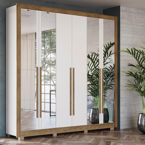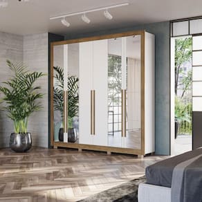 Na cor Branco/Nogueira, com 6 portas e 8 gavetas, espelho em quatro portas e pés em polipropileno, ele tem o tamanho ideal para um quarto de casal. Todo produzido com chapas de 15mm, o que garante mais robustez, firmeza e qualidade ao seu guarda-roupas.