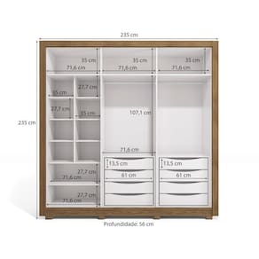 Cabideiro: Metálicos | Cor: Branco/Nogueira | Corrediças: Telescópicas | Garantia: 3 meses para defeito de fabricação | Gavetas: Internas | Matéria-prima: Polipropileno | Peso suportado por cada prateleira: 7 kg | Peso suportado por gaveta: 6 kg | Quantidade de gavetas: 8 | Quantidade de portas: 6 | Quantidade de prateleiras: 10 | Sistema de montagem: Parafuso Philips / Parafuso Philips e Minifix | Tipo de porta: Bater