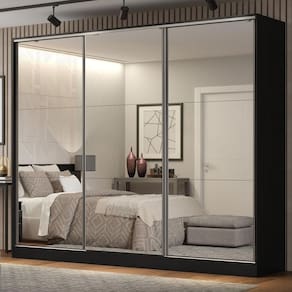 - Três (3) portas de correr com espelhos, apresentando sistema anti-descarrilhamento