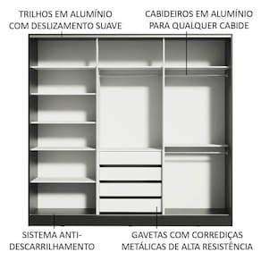 O acabamento em Pintura Poliéster branco confere proteção e permite combinar em qualquer decoração. Os tubos cabideiros são muito resistentes. A profundidade é ideal para qualquer tamanho de cabide. E para completar, 4 gavetas muito espaçosas. Cabe tudo de forma organizada: roupas, sapatos, acessórios, edredons e travesseiros.