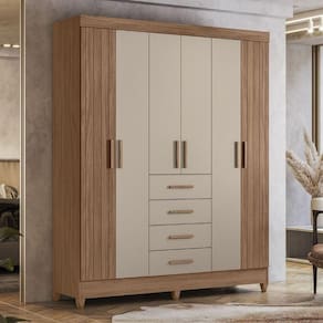 Os puxadores em MDF agregam charme ao design, oferecendo um toque de sofisticação aliado à resistência. Esse Roupeiro é altamente funcional, contando com quatro gavetas com corrediças metálicas que proporcionam abertura total e suave.