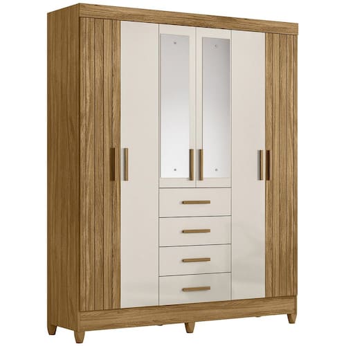 Os puxadores em MDF agregam charme ao design, oferecendo um toque de sofisticação aliado à resistência. Esse Roupeiro é altamente funcional, contando com quatro gavetas com corrediças metálicas que proporcionam abertura total e suave.