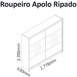 Combinando elegância e praticidade, o Roupeiro Apolo Ripado é a opção ideal para pessoas que buscam beleza e funcionalidade. Contando com sete gavetas em seu interno grandes, espaço para vestidos, colmeia organizadora, sapateira, amplo maleiro e quatro tubos cabineiros em alumínio, para marromhor dividir seus espaços. O toque especial deste roupeiro é a porta lateral em ripas autênticas e a gavetas porta joias, trazendo em sua composição quinze nichos para marromhor atender, além de contar com chave para sua proteção. Acabamento da Prateleira: Pintura UV Escala de Brilho da Prateleira: Semi-Fosco Possui Cabideiros: 03 Acabamento da Gaveta: Pintura UV Escala de Brilho da Gaveta: Semi-Fosco Material do Puxador da Gaveta: Plástico Possui Organizador de Gaveta: Sim Acabamento da Porta: Pintura UV Escala de Brilho da Porta: Semi-Fosco Material do Puxador da Porta: Metal Acabamento dos Pés: Pintura Acompanha Cama Auxiliar: Acompanha Colchão: Altura da Cama: Altura do Espelho: 46.5 Altura do Espelho 01: Altura do Espelho 02: Altura do Espelho 03: Altura do Espelho 04: Altura do Espelho 05: Altura do Espelho 06: Altura dos Pés: 6.5 Ambiente Principal: Quarto Cama Auxiliar Acompanha Colchão: Cama Auxiliar Suporta Até (kg): Cama Suporta Até (kg): Complexidade da Montagem: Alta: deve ser montado por um montador especializado Cor: Marromle/Off White Cor do Produto: Marromle/Off White Cor Flex: Não Cor Interna: Marromle Escala de Brilho: Semi-Fosco Espessura do Espelho: 3 Fita Integrada: Sim Formato do Espelho: Retangular Gaveta com Chave: Sim Guarda-Roupa Suporta Até (kg): 220 Informações Complementares: Fixação do espelho com fita dupla face + cola espelho. Itens Inclusos: 1 Guarda Roupa, Kit Ferragens e Manual de Montagem Largura da Cama: Largura do Espelho: 131.5 Largura do Espelho 01: Largura do Espelho 02: Largura do Espelho 03: Largura do Espelho 04: Largura do Espelho 05: Largura do Espelho 06: Linha ou Coleção: Apolo Manual de Especificação Técnica: https://cdn2.madeiramadeira.com.br/atributo/gelius/1198063-apolo-ripado-2p-rp-c-esp-c-pes.pdf Manual de Montagem e Instalação: https://cdn2.madeiramadeira.com.br/atributo/gelius/1198062-apolo-ripado-2p-rp-c-esp-c-pes.pdf Material da Gaveta: MDF Material da Porta: MDF Material da Prateleira: MDF Material dos Pés: Madeira Maciça Material Principal: MDF Montagem Flex: Sim Necessita Montagem: Sim Origem do Produto: Nacional Peso: 294 Peso Máximo por Gaveta: 10 Peso Máximo por Prateleira: 10 Possui Calceiros: 01 Possui Espaço para Vestidos Longos: Não Possui Espelho: Sim Possui Espelho Interno: Não Possui Ganchos: Não Possui iluminação: Não Possui Painel de TV: Não Possui Pés: 09 Possui Portas: 02 Possui Prateleiras: 09 Possui Sapateira: Não Profundida de Cama: Quantidade de Espelho: 04 Espelhos com Tamanhos Iguais Recomendações de Uso, Manutenção e Limpeza: A limpeza do produto deve ser feita por meio do uso de um pano, umedecido com água, e um pano seco. É importante para fazer a limpeza do móvel nunca utilizar produtos químicos ou abrasivos. Para conservar o padrão de qualidade dos produtos Gelius, nunca arraste um móvel se este estiver cheio. Nunca puxe o móvel de frente para você, pois ele pode balançar e provocar acidentes. Sapatas Niveladoras: Não Sistema de Montagem: Parafusos, Pregos e Cavilhas Tamanho do Colchão Indicado (L x C): Tamanho do Colchão Indicado Cama Auxiliar: Tipo de Corrediça da Gaveta: Metálica Telescópica Tipo de Dobradiça/Corrediça da Porta: Metálica Tipo de Estrado: Tipo de Fixação do Espelho: Fita Dupla Face Tipo de Gaveta: Interna Tipo de Guarda-Roupa: Casal Tipo de Madeira Maciça: Tipo de Madeira Maciça da Gaveta: Tipo de Madeira Maciça da Porta: Tipo de Madeira Maciça da Prateleira: Tipo de Madeira Maciça do Puxador da Gaveta: Tipo de Madeira Maciça do Puxador da Porta: Tipo de Madeira Maciça dos Pés: Pinus Tipo de Puxador da Gaveta: Externo Tipo de Puxador da Porta: Embutido