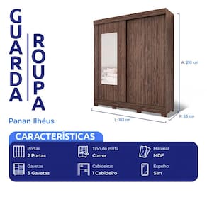 Características: Marca: Panan Modelo: Ilhéus Tipo: Casal Tipo de porta: Correr Quantidade de portas: 2 portas Quantidade de gavetas: 3 gavetas Quantidade de cabideiros: 1 cabideiro Sapateira: Sim Espelho: Sim Tamanho do espelho: 119,2 x 45 cm Espessura do espelho: 3 mm Gaveta com chave: Não Tipo de corrediças: Telescópicas Material da estrutura: MDF Pés: Sim Material dos pés: ABS