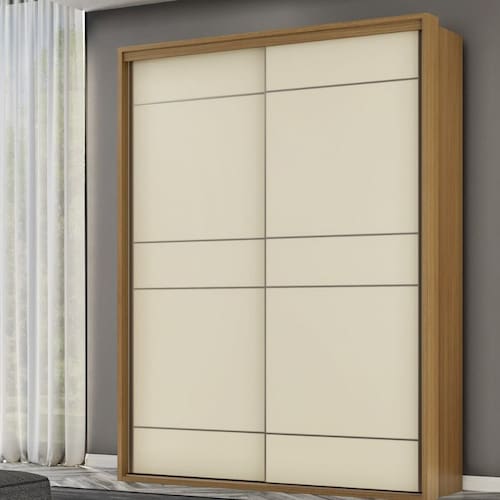 Guarda Roupa Casal 2 Portas de Correr 100 MDF Qualitá Belmax, oferece organização, aproveitamento de espaço e qualidade. com chapas de 15 e 25 mm, possui pintura texturizada resistente a riscos e batidas, além de laterais reforçadas para maior robustez. No modelo carvalho, as portas podem ser montadas nas cores carvalho ou off white. As portas de espelho têm perfis de alumínio e película de proteção. Puxadores de alumínio anodizado garantem durabilidade,