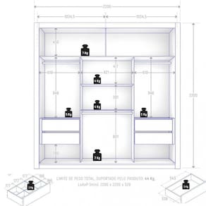 Características: Estrutura em MDP 2 Portas de correr 4 Gavetas Corrediças telescópicas Cabideiros metálicos Trilho inferior de alumínio e trilho superior de plástico Sistema com rolamentos e freios Produto suporta, no total, 44kg