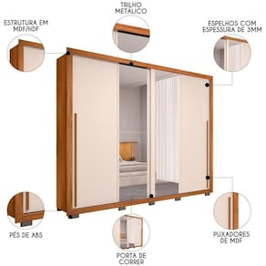 Com um interior espaçoso que incorpora 4 gavetas, estrategicamente distribuídas, e 3 cabideiros resistentes, suas roupas e acessórios estarão sempre ao alcance das mãos. O design moderno aliado às tonalidades neutras introduz uma paleta de cores que se adapta perfeitamente a qualquer decoração, adicionando um toque contemporâneo ao seu refúgio pessoal, enquanto os quatro espelhos proporcionam profundidade ao ambiente e completa o charme.