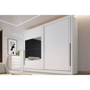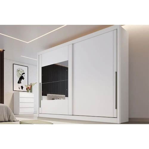 Material de Estrutura - MDF Espessura Material da Estrutura (mm) - Espessura 25mm Tipo de Pintura - Ultravioleta - Pintura 3D Ripada Tipo de Acabamento da Pintura - Pintura Fosca Tipo de Acabamento - Acabamento Interno Branco Tipo de Rodapé - Rodapés em MDF Diferenciais Guarda Roupas - Calceiro - Divisão Ele/Ela