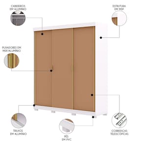 Internamente, o Guarda Roupa foi projetado para acomodar peças longas, com gavetas equipadas com corrediças telescópicas para um deslizamento suave e eficiente. A estrutura é 100% em MDF, garantindo alta resistência e durabilidade. O trilho em alumínio proporciona um deslizamento leve, enquanto a moldura metálica das portas e o acabamento dourado adicionam um toque refinado e sofisticado.