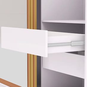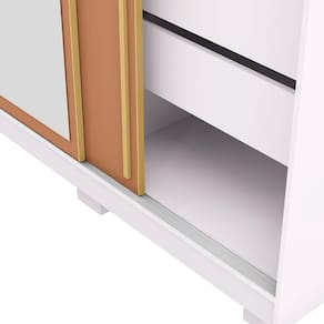Internamente, o Guarda Roupa foi projetado para acomodar peças longas, com gavetas equipadas com corrediças telescópicas para um deslizamento suave e eficiente. A estrutura é 100% em MDF, garantindo alta resistência e durabilidade. O trilho em alumínio proporciona um deslizamento leve, enquanto a moldura metálica das portas e o acabamento dourado adicionam um toque refinado e sofisticado.