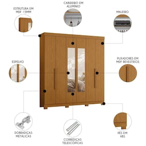 Com seis portas de dobradiças metálicas, sendo duas delas com espelho, o Guarda Roupa proporciona um acesso amplo e fácil ao interior, permitindo que você armazene suas roupas de forma eficiente. Seu design moderno é complementado por puxadores de MDF revestidos, que conferem um acabamento refinado e sofisticado, enquanto os três cabideiros de alumínio oferecem a solução perfeita para pendurar roupas com praticidade e organização. Além disso, o Guarda Roupas 6 Portas conta com três gavetas equipadas com corrediças telescópicas, garantindo um deslizamento suave e durável. A combinação das gavetas com os cabideiros proporciona um equilíbrio entre espaço para pendurar e armazenar, oferecendo versatilidade para as suas necessidades diárias. Os pés inclusos no design do não apenas conferem um toque de modernidade ao visual, mas também facilitam a limpeza, mantendo o móvel levemente elevado do chão. Com uma estrutura sólida e funcional, é a escolha ideal para quem busca um móvel durável, organizado e com um design elegante, capaz de otimizar o Quarto de Casal de forma prática e sofisticada. É a solução perfeita para quem deseja manter o ambiente ordenado e, ao mesmo tempo, adicionar um toque de sofisticação ao seu quarto ou closet.
