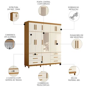 Um Guarda Roupa Grande, com onze portas com dobradiças metálicas, que proporciona um amplo espaço de armazenamento e facilita o acesso às suas roupas e acessórios. A estrutura foi projetada para oferecer durabilidade, com a utilização de painéis de 15mm, garantindo resistência ao longo do tempo. As seis gavetas com corrediças telescópicas oferecem um deslizamento suave e eficiente, ideais para organizar itens menores. O Guarda Roupa conta com dois cabideiros em alumínio, oferecendo um espaço prático e organizado para pendurar suas roupas. Além disso, a peça é composta por três módulos que podem ser facilmente separados, o que facilita o transporte e a adaptação ao ambiente. Os pés com regulagem de altura, garante estabilidade e a possibilidade de ajuste conforme o tipo de piso, facilitando a limpeza e proporcionando um acabamento perfeito. É a opção ideal para organizar e otimizar seu espaço de maneira eficiente e ainda inovar o Quarto de Casal com um toque moderno.