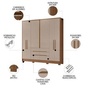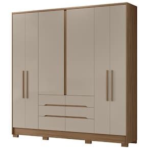 Os puxadores em MDF nas portas e as gavetas com puxadores cava, agregam charme ao design, oferecendo um toque de sofisticação aliado à resistência. Esse Roupeiro é altamente funcional, contando com seis gavetas com corrediças telescópicas que proporcionam abertura total e suave.