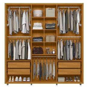 As seis portas convencionais contam com dobradiças metálicas já com sistema de amortecimento, garantindo um fechamento suave e silencioso. As prateleiras internas bem distribuídas acomodam diferentes tipos de itens, desde bolsas, sapatos até malas. Os puxadores em MDF reforçam o visual minimalista.