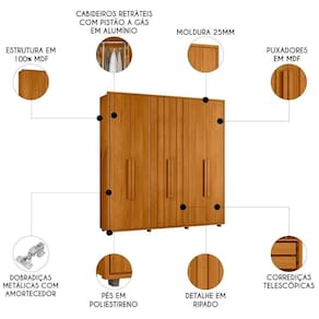As seis portas convencionais contam com dobradiças metálicas já com sistema de amortecimento, garantindo um fechamento suave e silencioso. As prateleiras internas bem distribuídas acomodam diferentes tipos de itens, desde bolsas, sapatos até malas. Os puxadores em MDF reforçam o visual minimalista.
