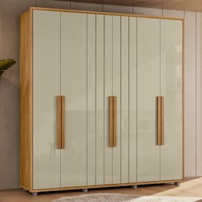 As seis portas convencionais contam com dobradiças metálicas já com sistema de amortecimento, garantindo um fechamento suave e silencioso. As prateleiras internas bem distribuídas acomodam diferentes tipos de itens, desde bolsas, sapatos até malas. Os puxadores em MDF reforçam o visual minimalista.