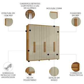 As quatro gavetas espaçosas, equipadas com corrediças telescópicas, proporcionam abertura total e mais conforto na hora de organizar. Os pés em poliestireno garantem estabilidade à estrutura. O Guarda Roupa Casal equilibra presença e funcionalidade, elevando o padrão do ambiente com muito estilo.