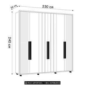 As seis portas convencionais sendo as duas laterais com espelho, contam com dobradiças metálicas já com sistema de amortecimento, garantindo um fechamento suave e silencioso. As prateleiras internas bem distribuídas acomodam diferentes tipos de itens, desde bolsas, sapatos até malas. Os puxadores em MDF reforçam o visual minimalista.
