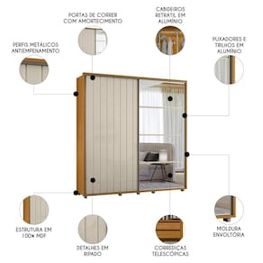 Características do Produto Material da Estrutura: 100% MDF. Material do Fundo: MDF 3mm. Estrutura das Chapas: 15mm/25mm. Peso Suportado: 132 kg Distribuídos. Acabamento: Pintura UV. Escala de Brilho: Fosco/Brilho. Quantidade de Portas: 2 Portas. Tipo de Porta: Deslizantes. Possui Cabideiro: Sim. Quantidade de Cabideiros: 6 Cabideiros. Material dos Cabideiros: Alumínio. Possui Gaveta: Sim. Quantidade de Gavetas: 4 Gavetas. Tipo de Corrediças: Telescópicas. Possui Puxador: Sim. Material do Puxador: Alumínio. Possui Prateleiras: Sim. Quantidade de Prateleiras: 6 Prateleiras. Possui Pés: Sim. Material dos Pés: Poliestireno. Possui Espelho: Sim. Diferenciais: - Moldura de 25mm. - Perfis metálicos antiempenamento. - Perfis metálicos. - Cabideiros retráteis, com pistão a gás. - Corrediças telescópicas. - Puxadores em alumínio. - Porta deslizante com espelhos. Sistema de Montagem: Minifix / Cavilhas / Parafusos. Manual de Montagem: Sim. Complexidade da Montagem: Alta. Volumes: 7 Volumes. Conteúdo da embalagem: 1 Guarda Roupa. Garantia do Fabricante: 90 dias contra defeito de fabricação. Montagem: Recomendamos que seja feita por um profissional. Recomendação de Limpeza: Utilize pano levemente úmido.